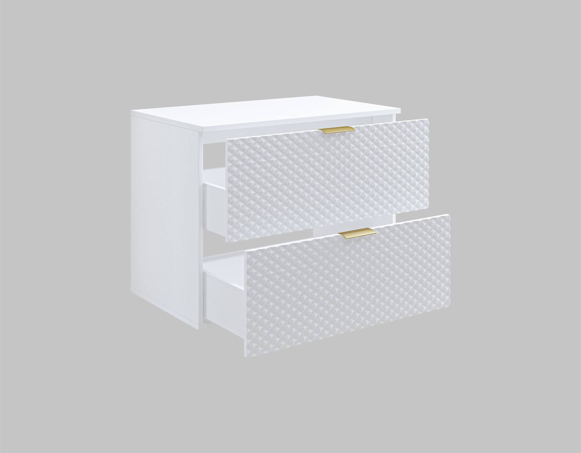 Szafka Pod Umywalkę Laura 2S to elegancka, wisząca jednostka o matowym, białym wykończeniu i złotych uchwytach. Wykonana z wytrzymałej płyty MDF i laminowanej, zapewnia praktyczność dzięki zawiasom z cichym domykiem.