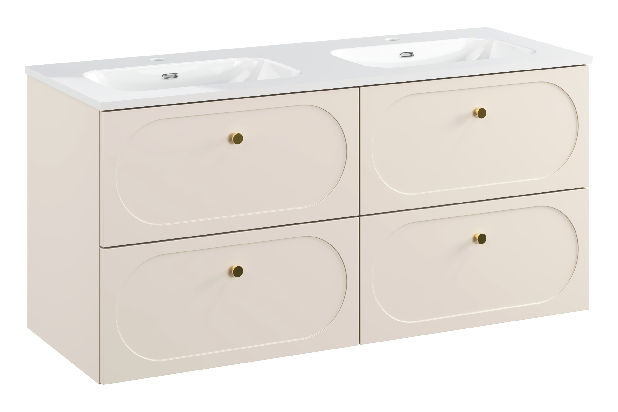 - Elegancka szafka z umywalką Donna Sand o szerokości 120 cm to połączenie nowoczesności i klasyki. Beżowe fronty z frezowaniem oraz złote metalowe uchwyty tworzą harmonijną całość. 4 pojemne szuflady z systemem cichego domykania zapewniają komfort.
