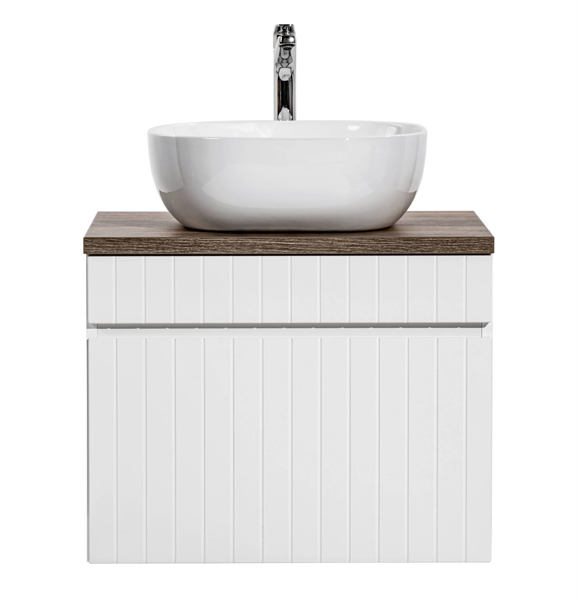 - Biała szafka pod umywalkę o szerokości 60 cm z jedną szufladą.