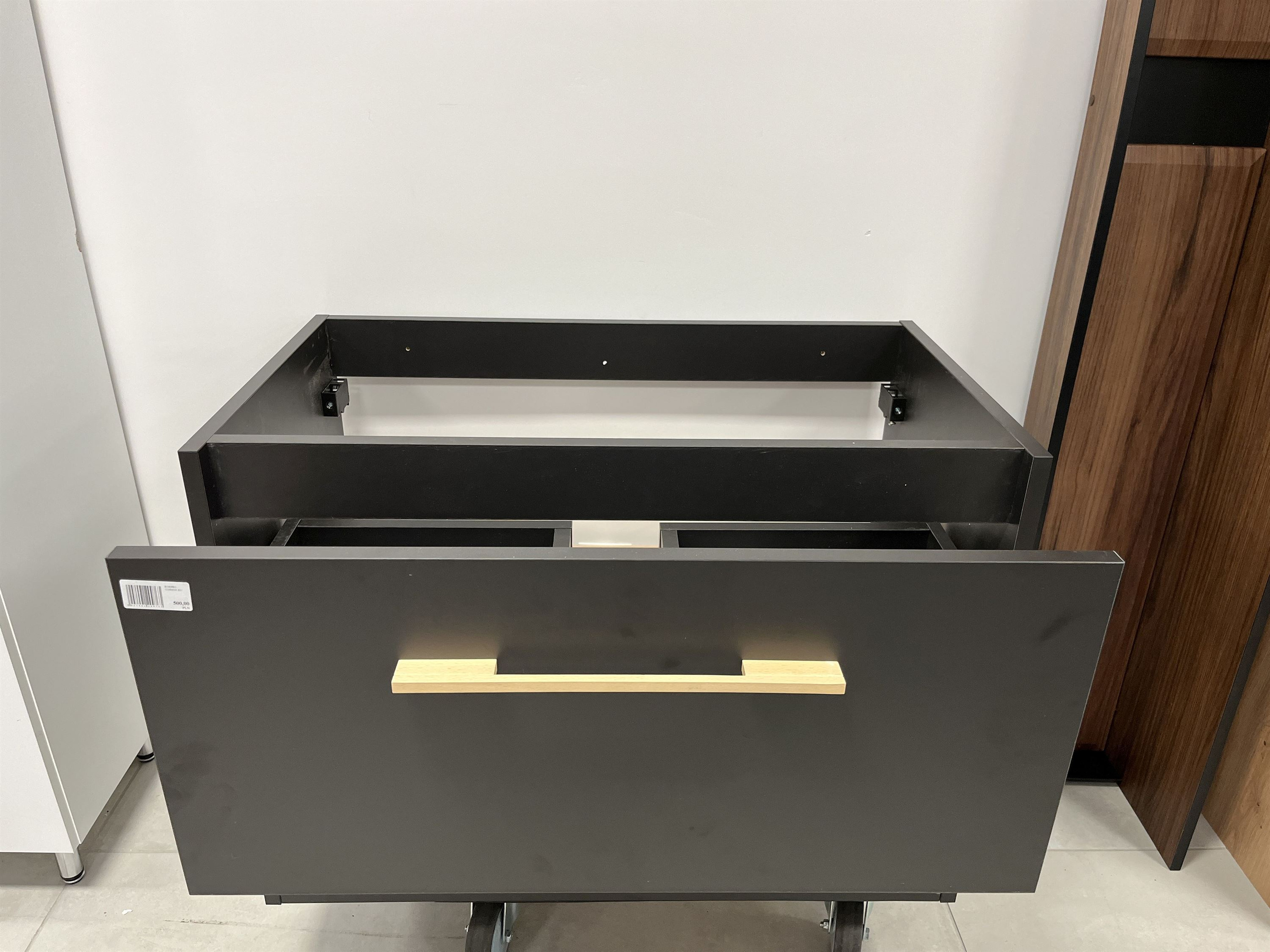 - Szafka pod umywalkę o szerokości 80 cm z jedną funkcjonalną szufladą i wnęką do przechowywania.