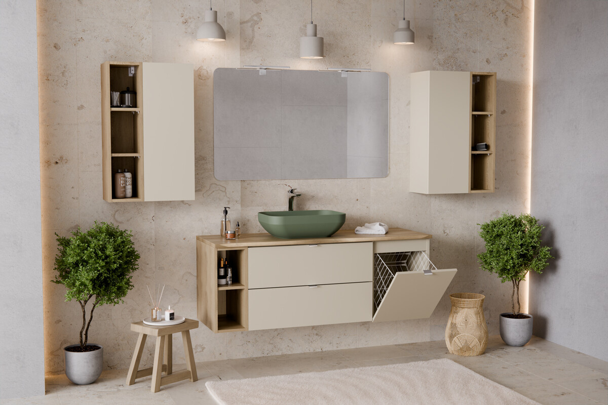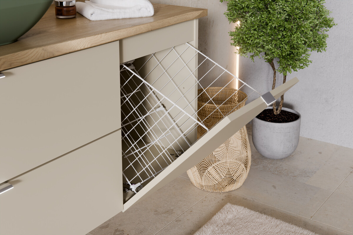 Szafka Dalia Cashmere to mebel z koszem na pranie, wykonany z trwałej płyty laminowanej. Ciepły kolor kaszmiru wprowadza harmonię, a możliwość wyboru uchwytów w trzech stylach, pozwala na personalizację. Idealna do łazienki, łatwa w montażu.