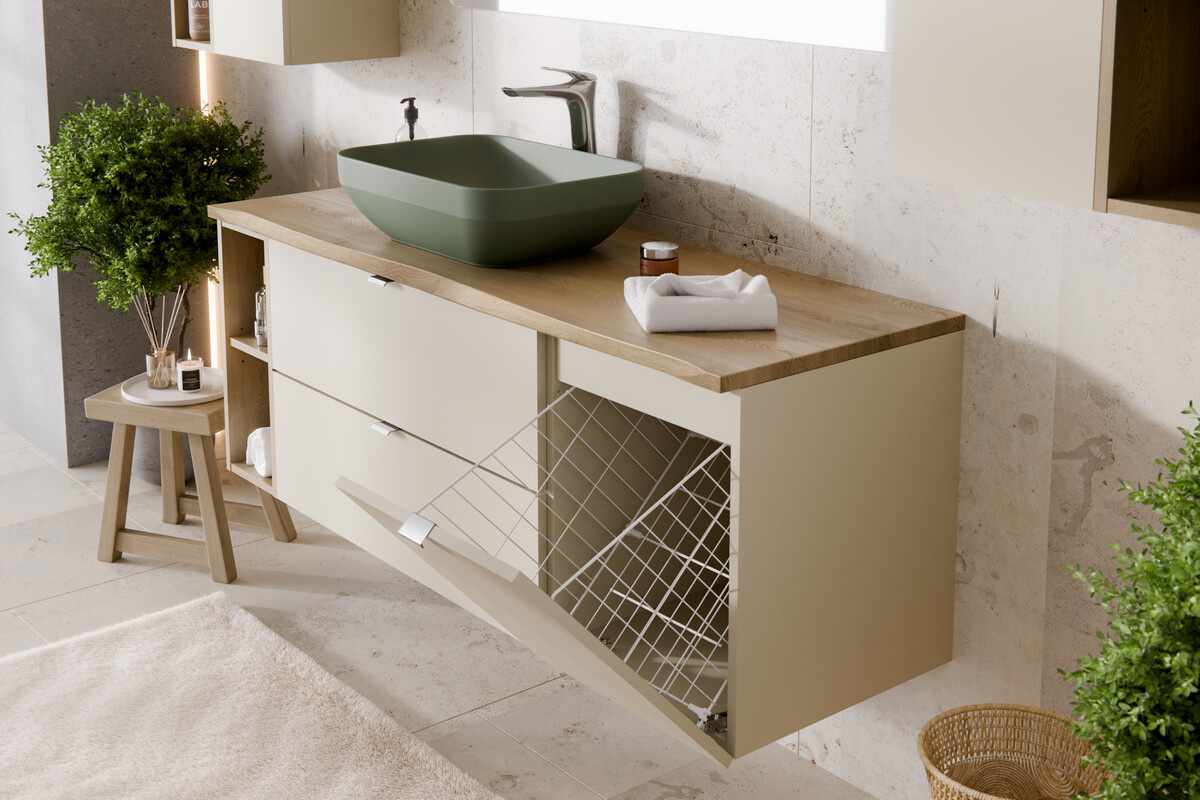 - Szafka Dalia Cashmere to mebel z koszem na pranie, wykonany z trwałej płyty laminowanej. Ciepły kolor kaszmiru wprowadza harmonię, a możliwość wyboru uchwytów w trzech stylach, pozwala na personalizację. Idealna do łazienki, łatwa w montażu.