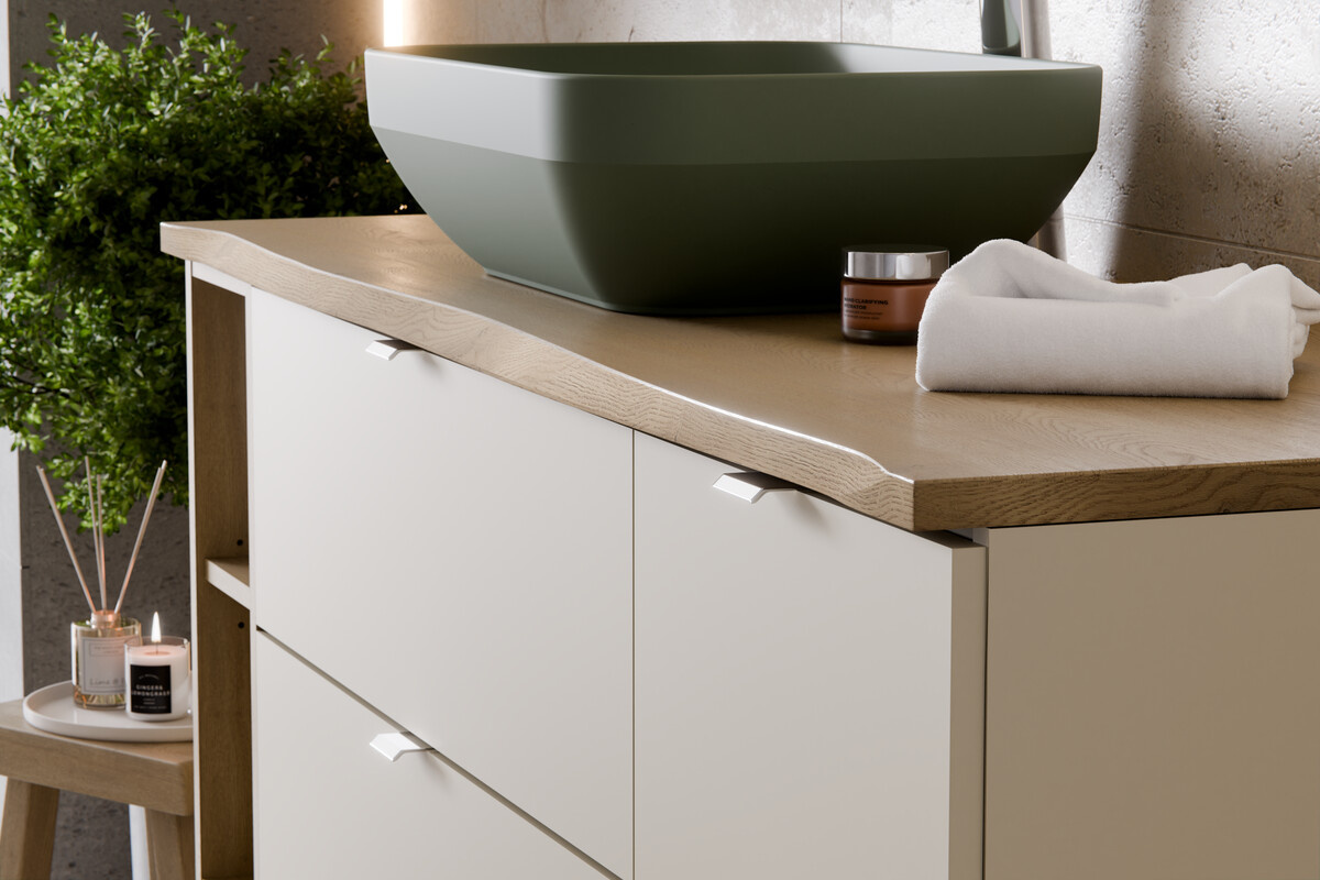 Każdy detal szafki Dalia Cashmere jest starannie przemyślany, co przekłada się na estetykę i trwałość produktu. Solidna konstrukcja oparta na płycie laminowanej gwarantuje długotrwałe użytkowanie, a cichy domyk zawiasów zapewnia komfort codziennego użytku. Nic nie zakłóci Twojego spokoju podczas korzystania z tej eleganckiej szafki.