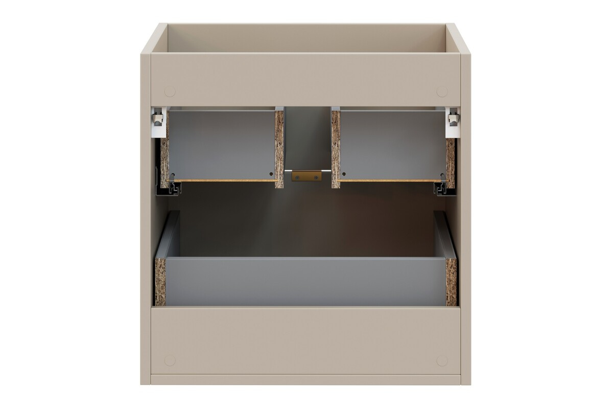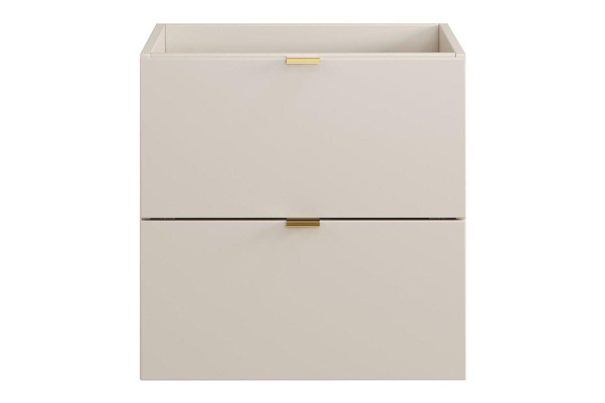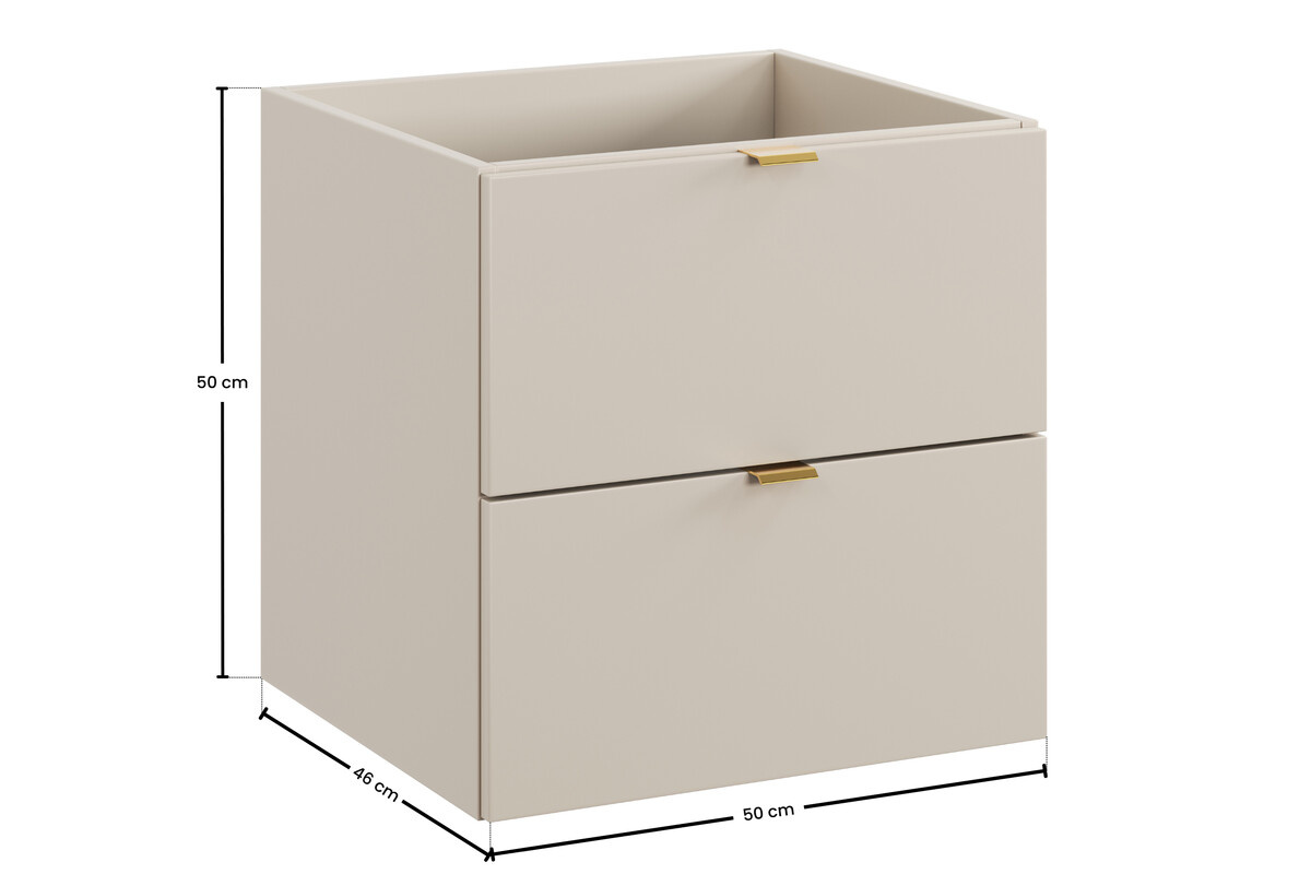 Szafka pod umywalkę Dalia Cashmere 50 cm łączy minimalistyczny design z funkcjonalnością. Gładkie fronty w delikatnym odcieniu kaszmiru oraz stylowe uchwyty w trzech kolorach pozwalają na personalizację. Dwie pojemne szuflady z systemem cichego domykania