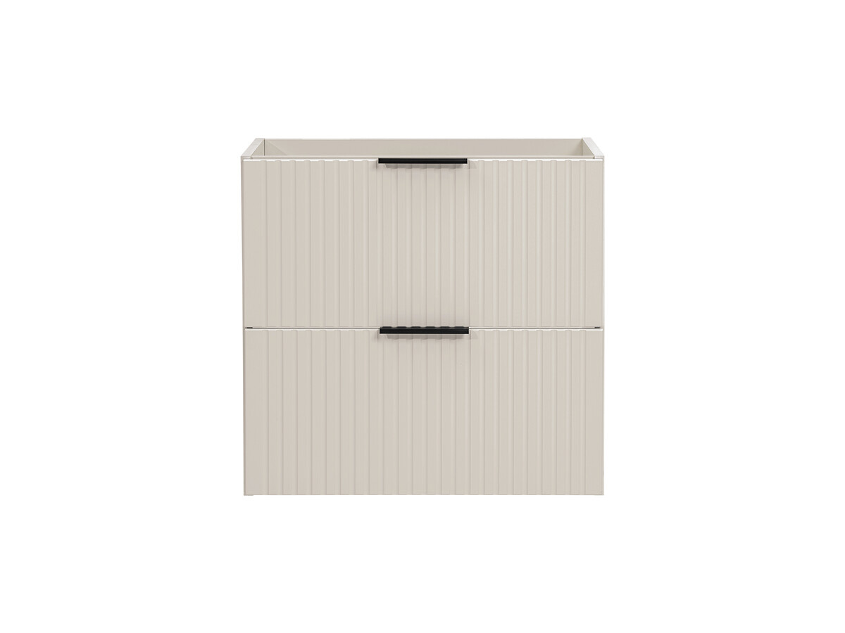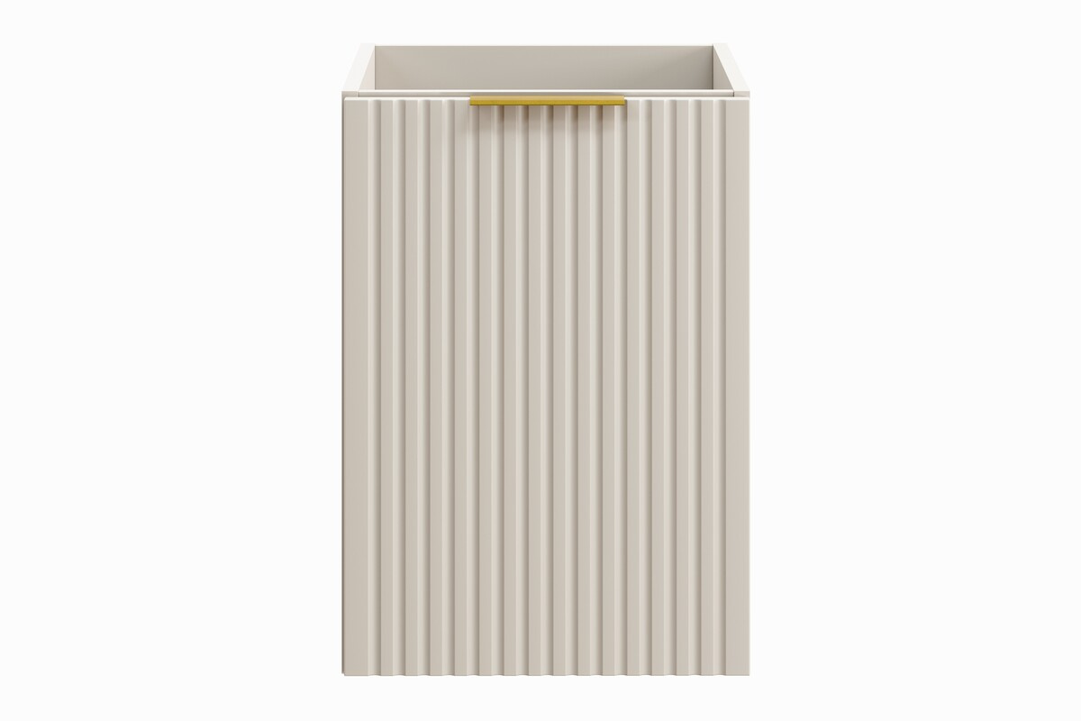 Kolor kaszmir mat, który zdobi zarówno fronty mebli, jak i blatu, wprowadza do wnętrza elegancki wygląd, a frezowane ryfle pionowe dodają szafkom unikalnego charakteru. Możliwość wyboru zróżnicowanych kolorów uchwytów - w tym złotego połysku, czarnego matu i chromu - pozwala na przystosowanie zestawu do własnych preferencji estetycznych, dzięki czemu Twoja łazienka zyska indywidualny styl.