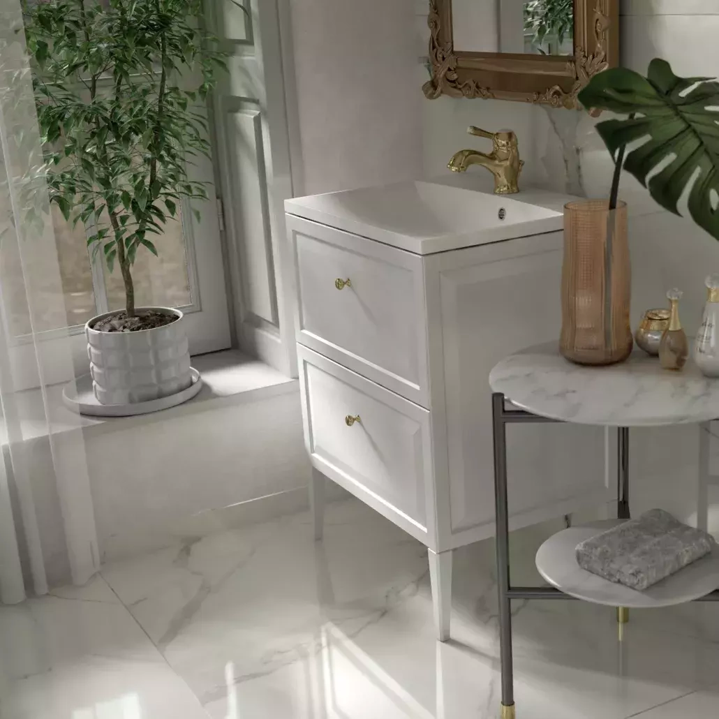 - Szafka pod umywalkę w kolorze białym matowym z dwiema szufladami. Do szafki dołączony adapter do nóżek.