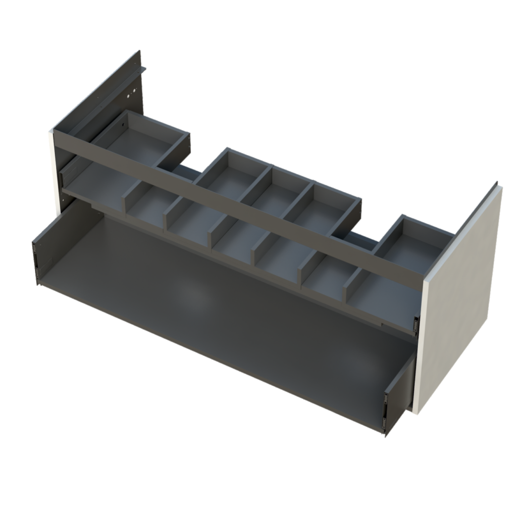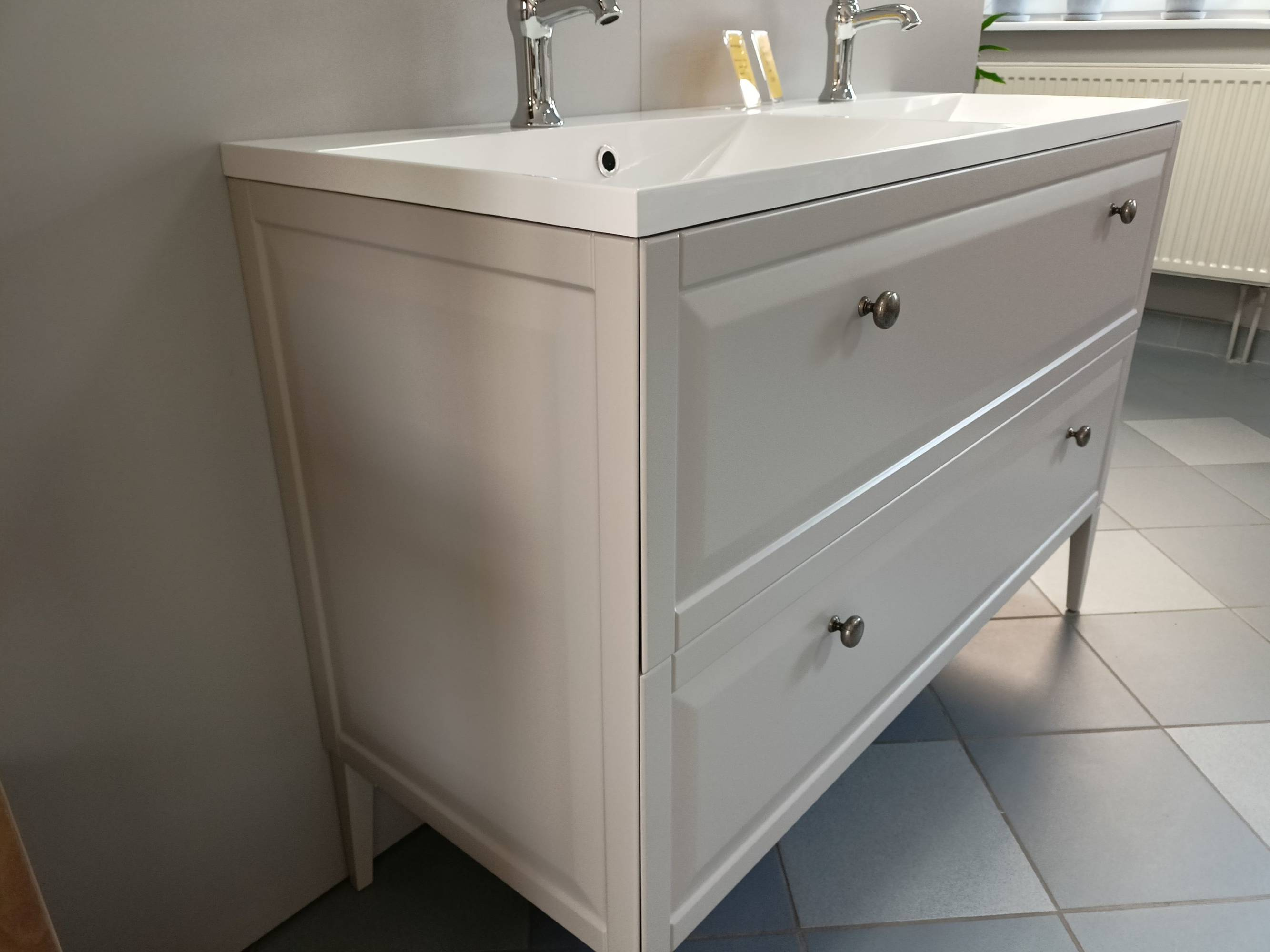 • Szafka pod umywalkę w kolorze piaskowym matowym z dwiema szufladami z umywalką pojedynczą Amelia