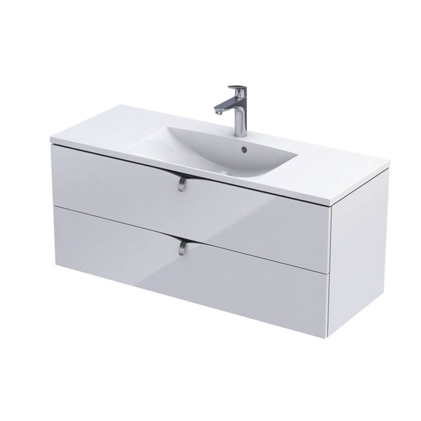 • Szafka pod umywalkę o szerokości 120 cm w kolorze biały połysk z dwiema szufladami.