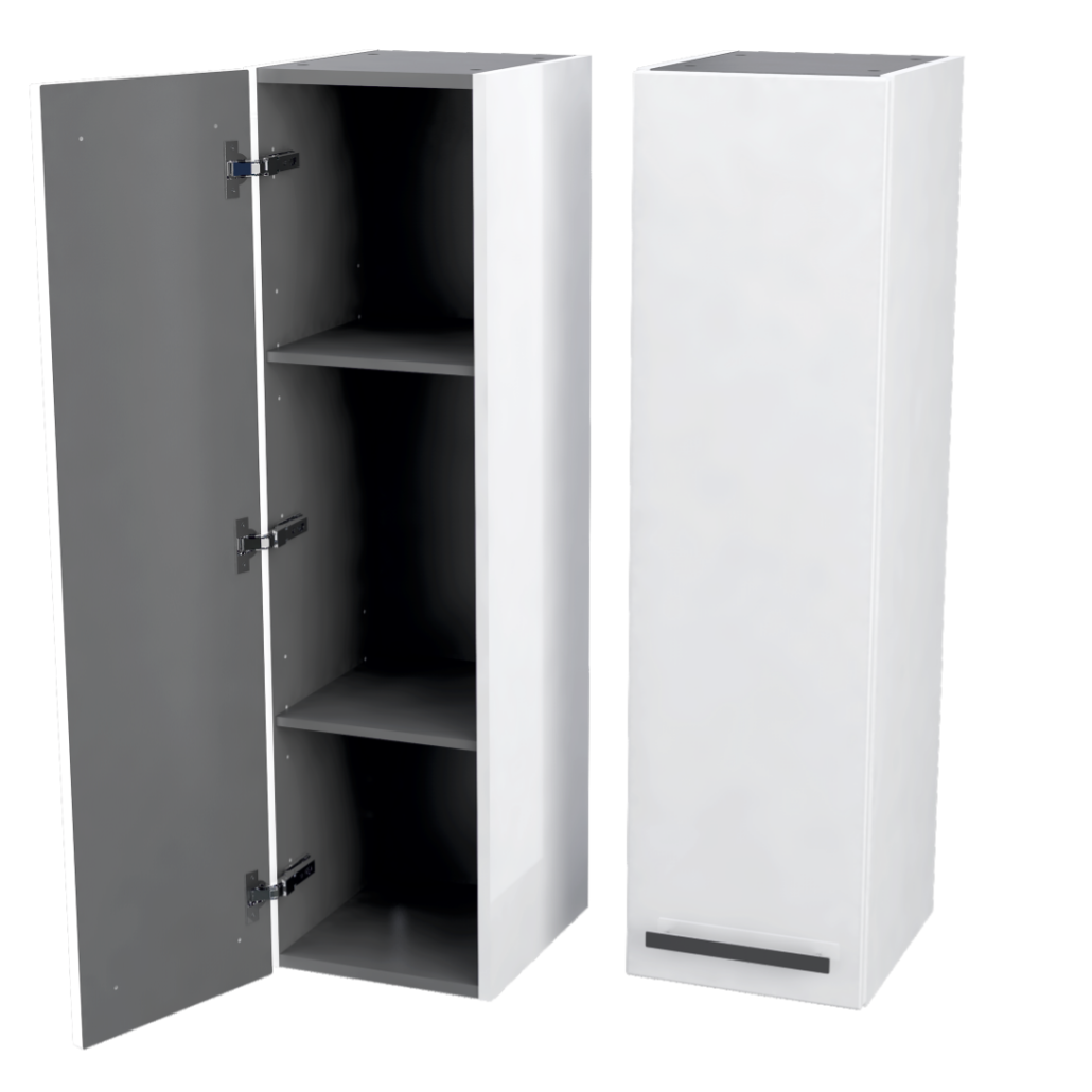 • Słupek wysoki (szafka wysoka boczna) w kolorze białym w połysku z jednymi drzwiami.