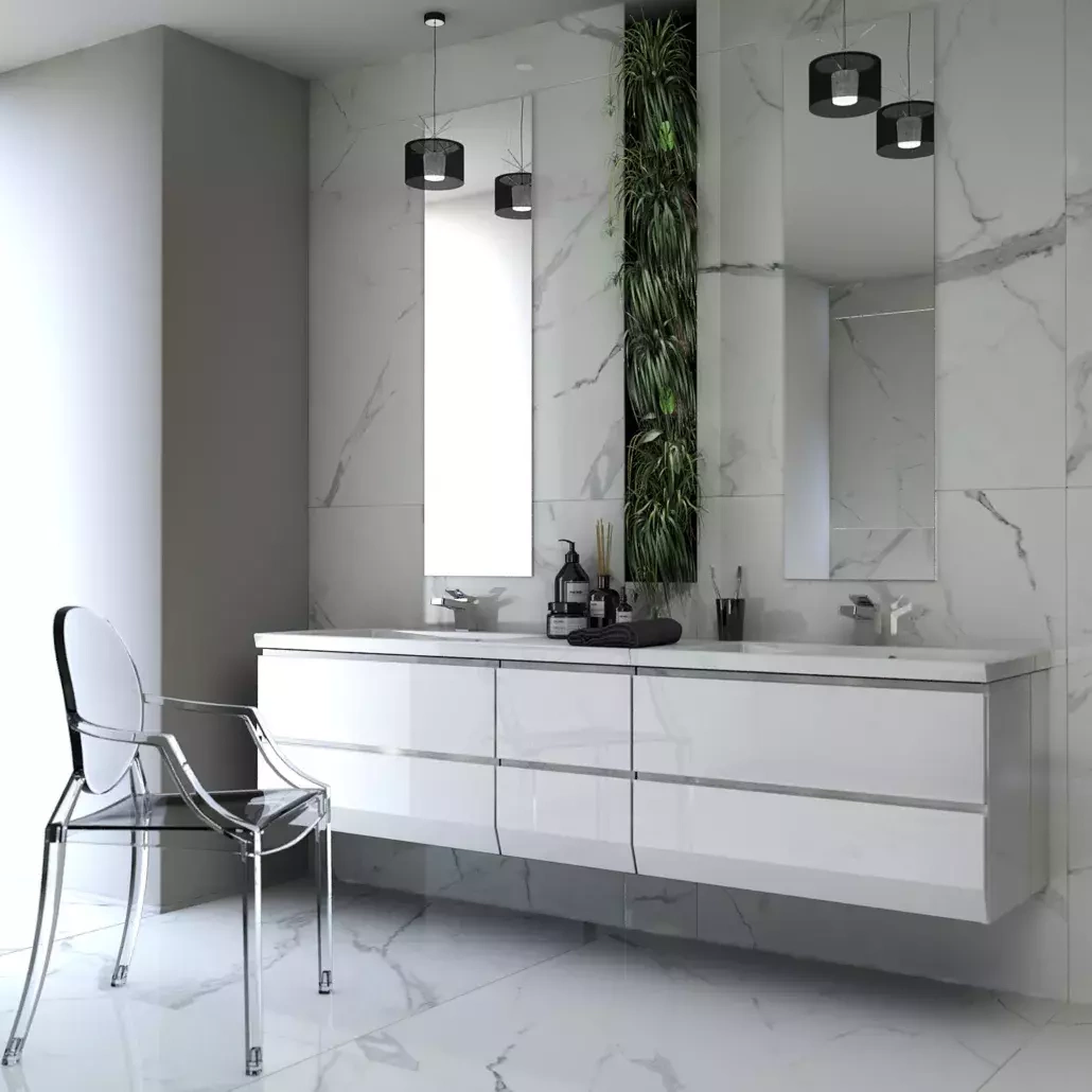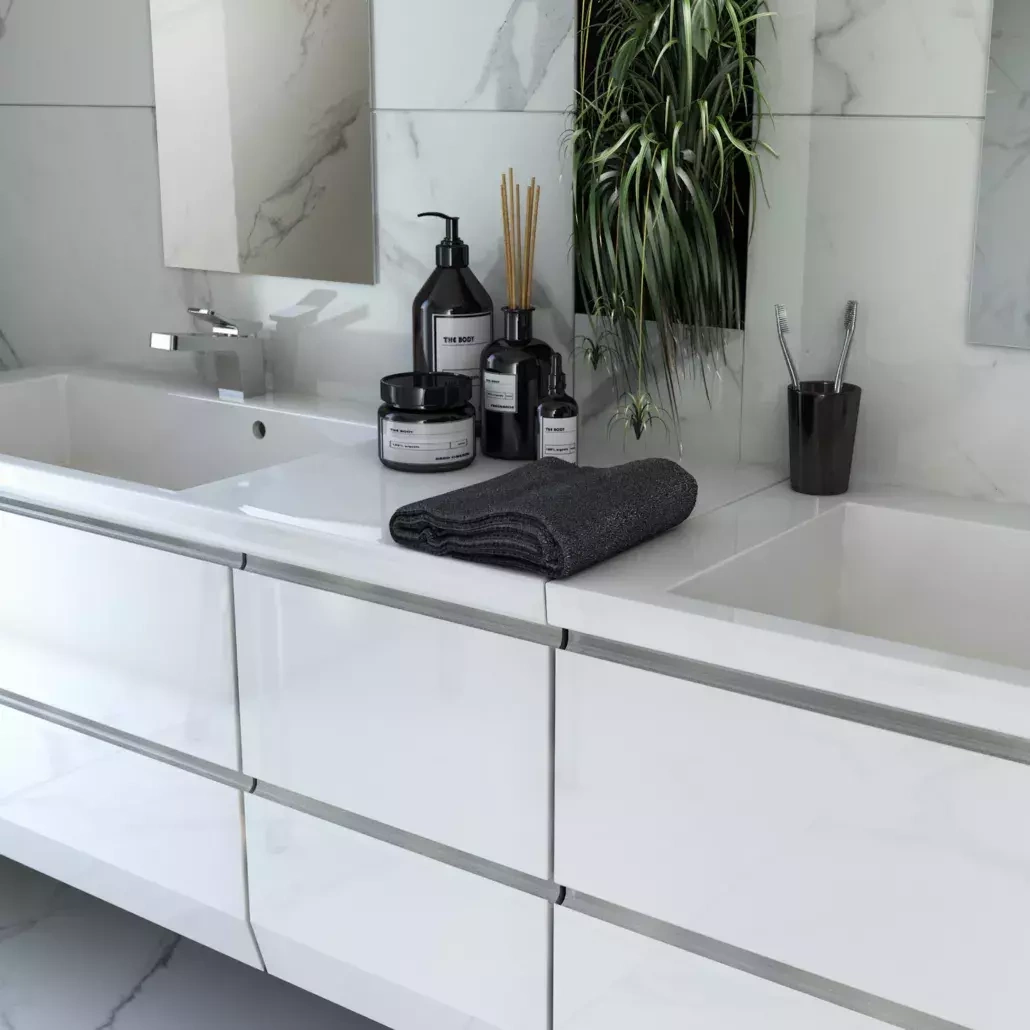 • Szafka pod umywalkę 85 cm w kolorze białym w połysku z dwiema szufladami.
