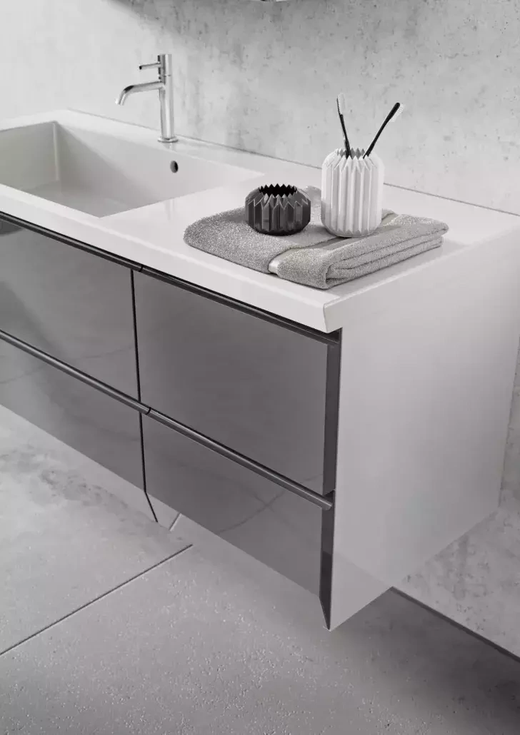 BRYLANT Pewność i zdecydowanie. Wyraźne krawędzie brył, dodatkowo podkreślone dynamicznymi, ukośnymi akcentami, zdecydowana geometria formy. Z jednej strony – twarda i wyraziście narysowana, z drugiej – wprowadzająca do wnętrza ład i proste zasady. BRYLANT jest synonimem porządku, dokładności i precyzji. Jeżeli cenisz te aspekty, ale również zwracasz uwagę na proporcje i finezyjne detale – BRYLANT to kolekcja dla Ciebie. Szafki pod umywalkowe BRYLANT można kompletować z szafkami bocznymi i przykrywać wspólnymi umywalkami o szerokości 125 cm. Zyskujemy zestaw o czterech, zróżnicowanych wielkością szufladach i dużej powierzchni blatu na umywalce.