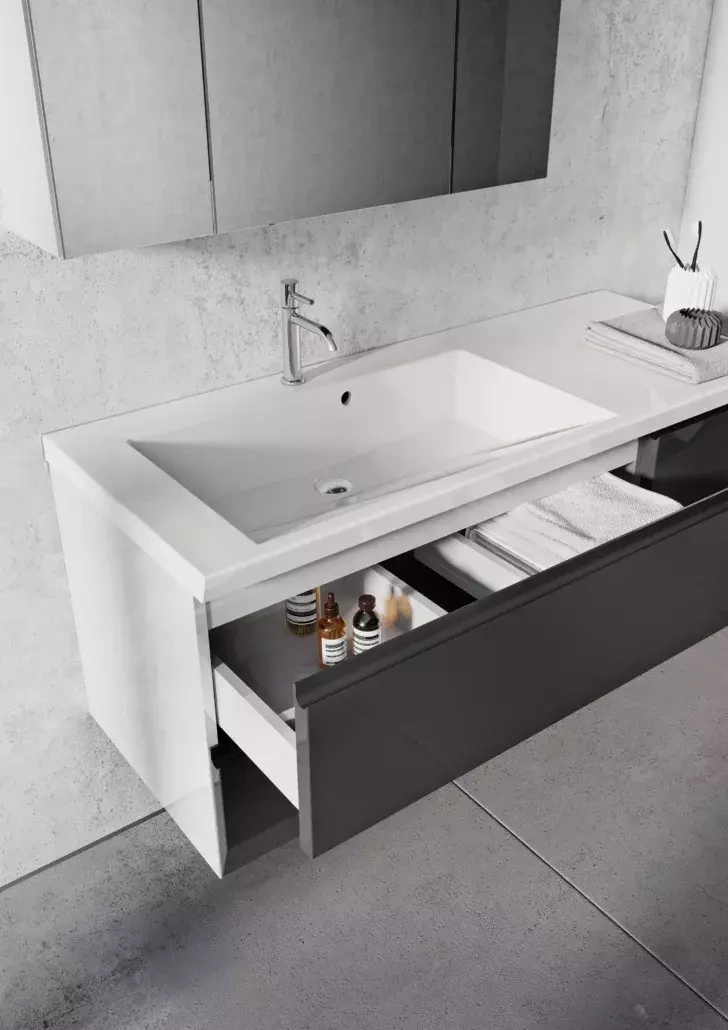 • Szafka pod umywalkę 40 cm w kolorze białym w połysku z frontami grafitowymi w połysku z dwiema szufladami