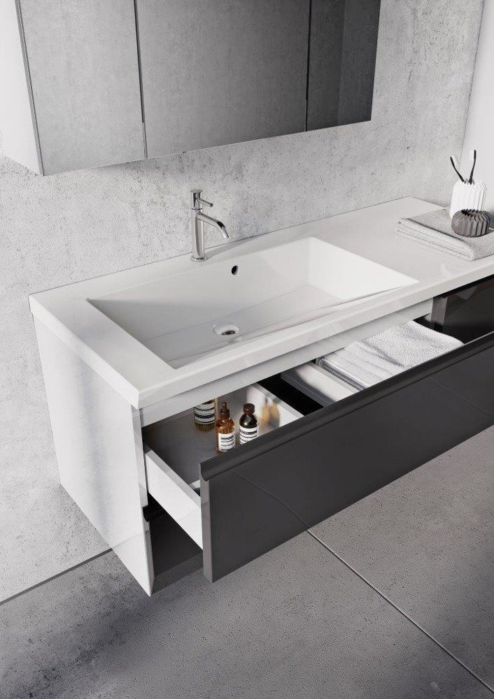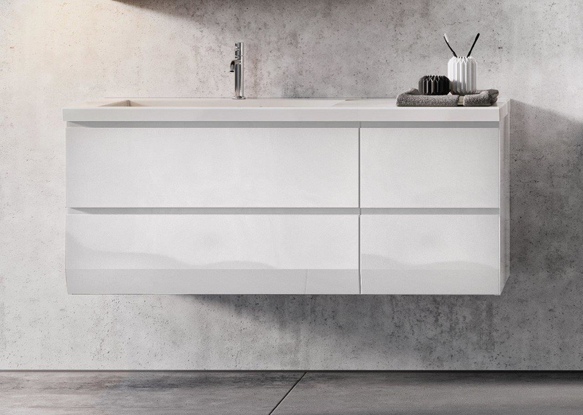- Szafka pod umywalkę 85 cm i szafka pod umywalką 40 cm w kolorze białym w połysku z czterema szufladami i umywalką 125 cm