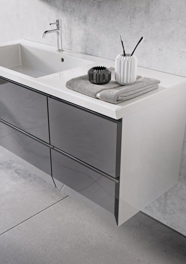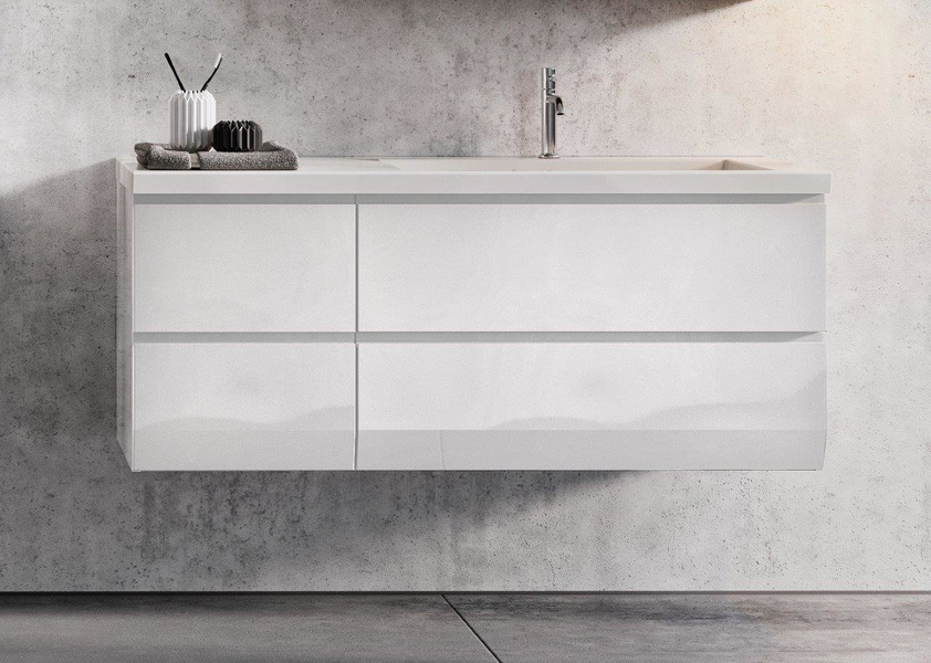 - Szafka pod umywalkę 85 cm i szafka pod umywalkę 40 cm w kolorze białym w połysku z czterema szufladami oraz umywalką