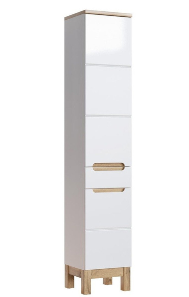 - Szafka łazienkowa z kolekcji Bali charakteryzuje się białymi frontami w połysku z subtelnymi wstawkami drewnopodobnymi, zawiasy i prowadnice posiadają system cichego zamykania.