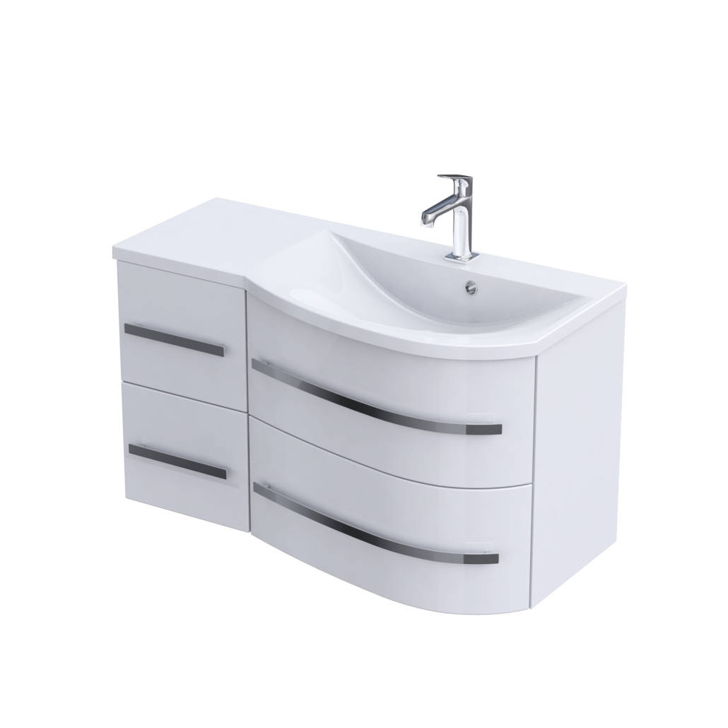 • Szafka z umywalką o szerokości 90 cm w kolorze białym w połysku z czterema szufladami