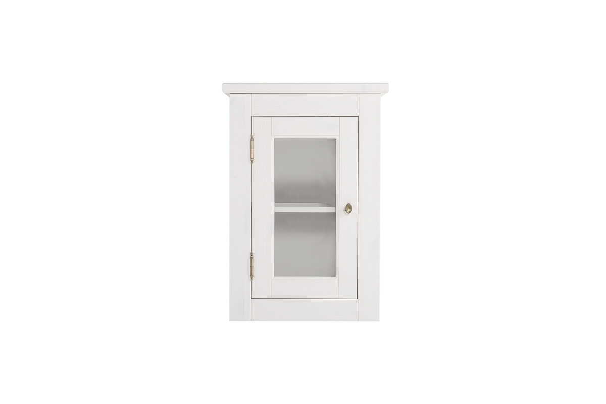 - Wisząca szafka łazienkowa została w całości wykonana z naturalnego drewna sosnowego. Dla ułatwienia front szafki posiada przezroczystą szybę, szafki łazienkowe Romantic wyróżnia piękny biały odcień z prześwitującą strukturą drewna