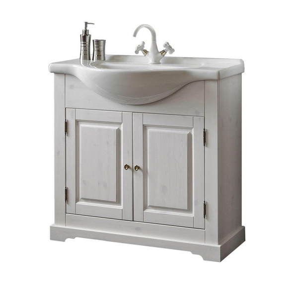 - Stojąca szafka pod umywalkę o szerokości 85 cm została w całości wykonana z naturalnego drewna, które zostało polakierowane na klasyczny biały kolor z delikatnie prześwitująca strukturą drewna.