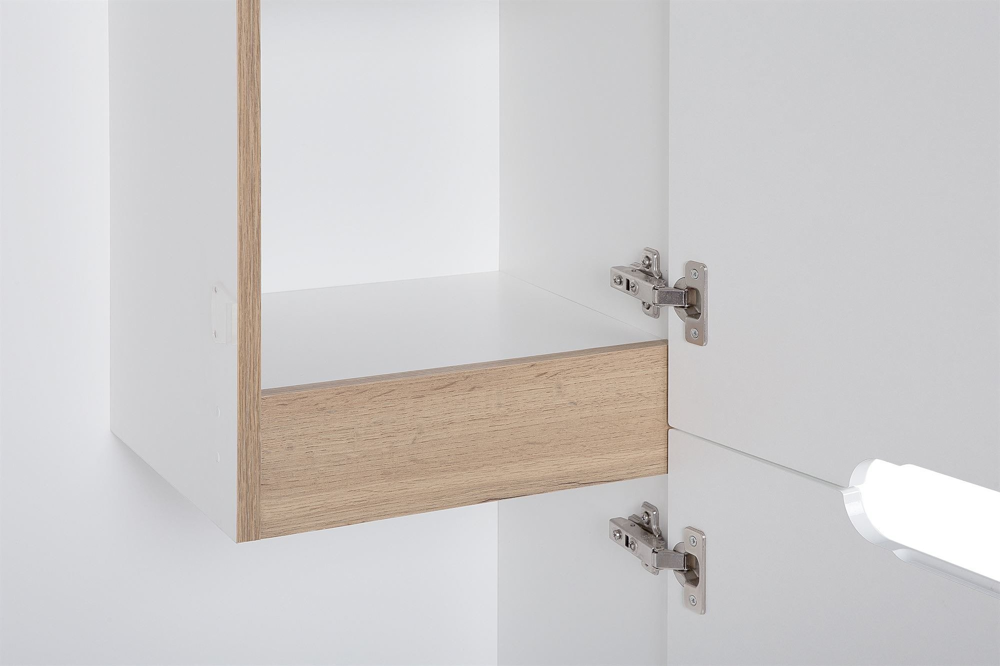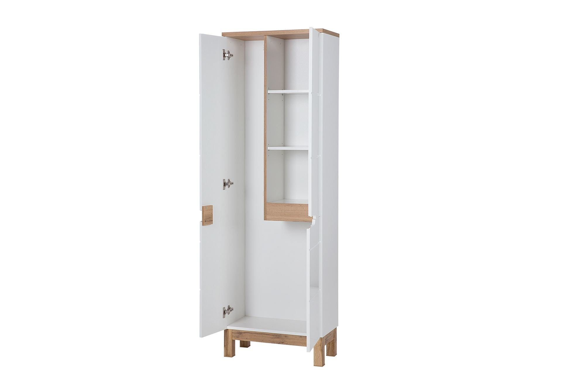 - Szafa łazienka z kolekcji Bali charakteryzuje się białymi frontami w połysku z subtelnymi wstawkami drewnopodobnymi, zawiasy i prowadnice posiadają system cichego zamykania.