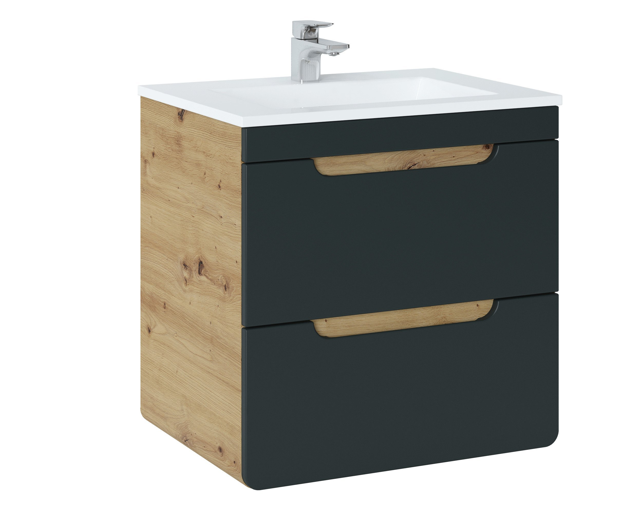 - Szafka pod umywalkę o szerokości 60 cm z dwiema szufladami, z frontami w kolorze ciemnego grafitu, matowe wykończenie, szafka wyposażona w system cichego domykania.