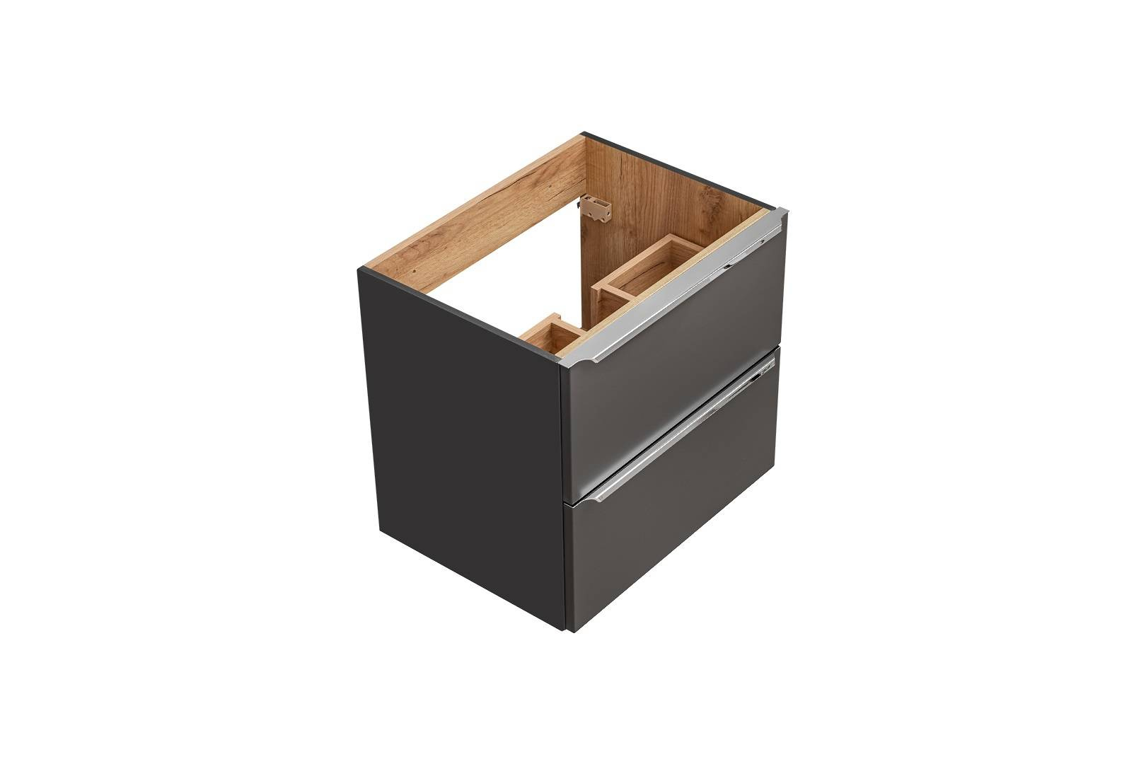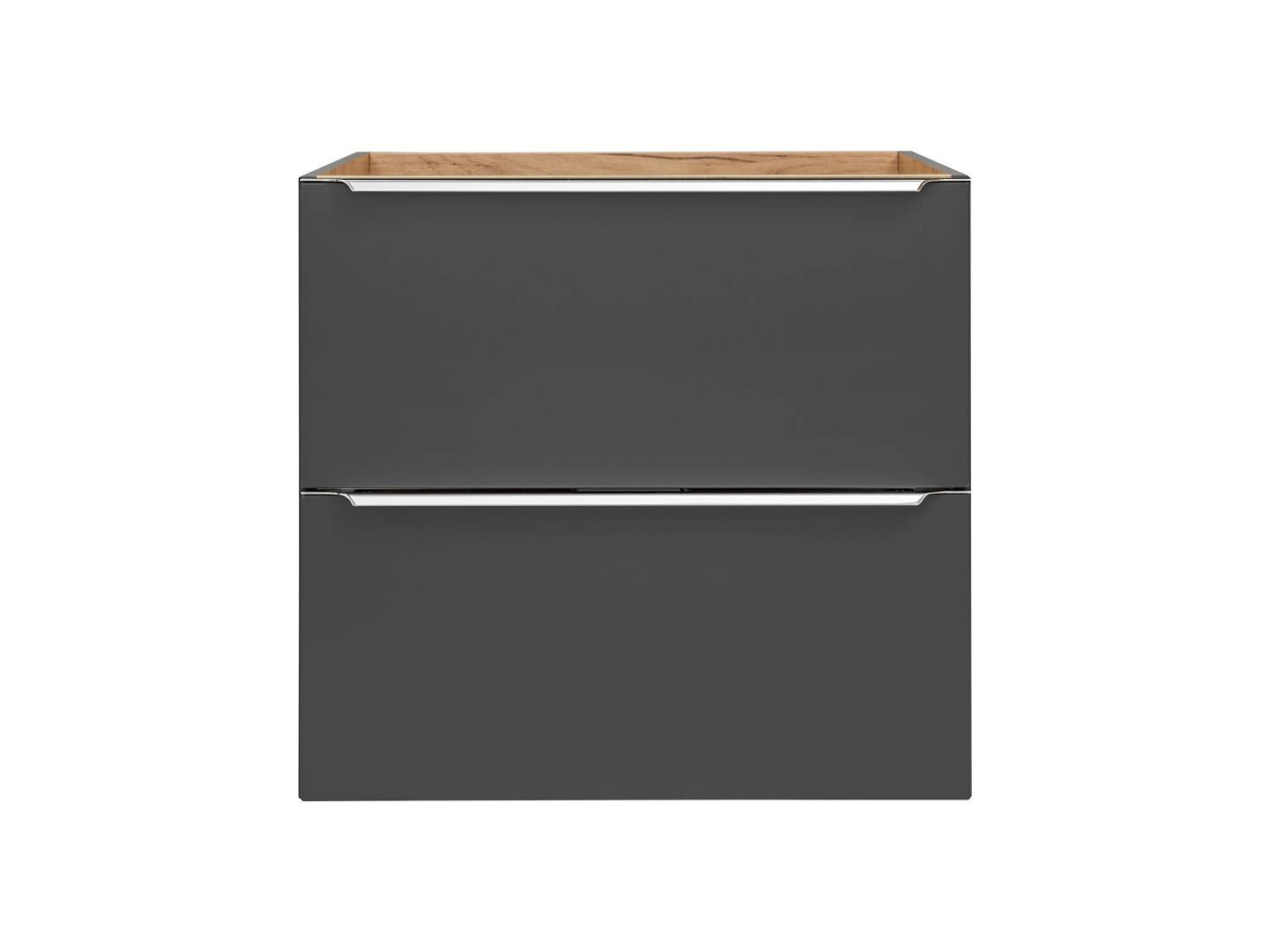 - Grafitowa szafka pod umywalkę z uchwytami krawędziowymi i dwiema szufladami.
